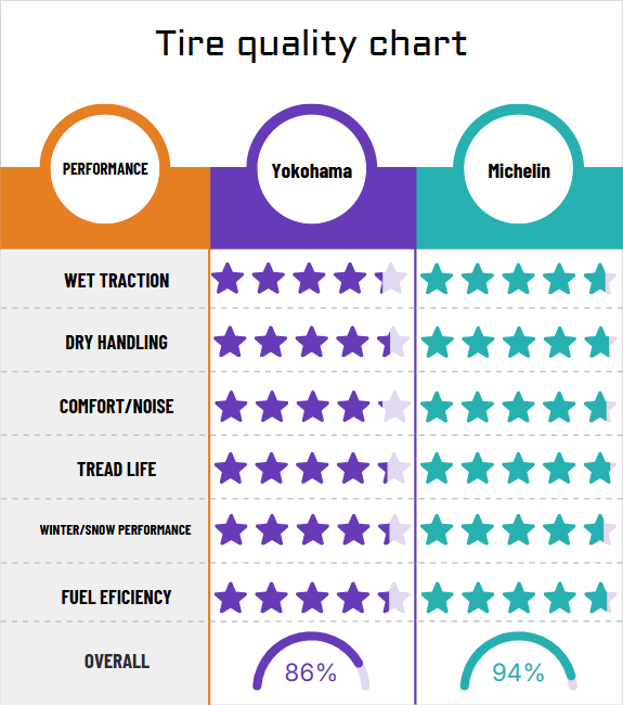 Here’s a generalized comparison of Michelin and Yokohama tires across five key performance categories, expressed as percentages (where 100% represents the theoretical peak performance for any tire).